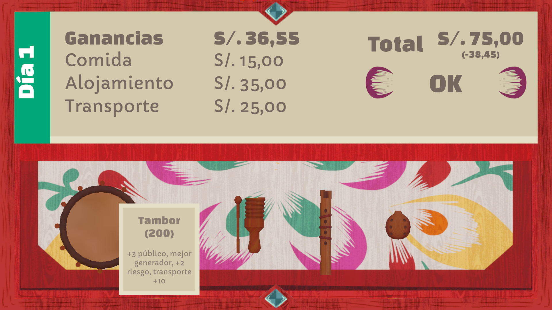 - Puedes comprar instrumentos, estos mejoran tus cartas… pero también aumentan el riesgo en tu mazo actual
