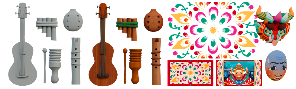 Visualmente, el juego se inspira en los retablos ayacuchanos: composiciones llenas de elementos, colores y escenas donde todo convive en un mismo espacio. Incorpora también instrumentos andinos como zampoñas, quenas y tambores.
